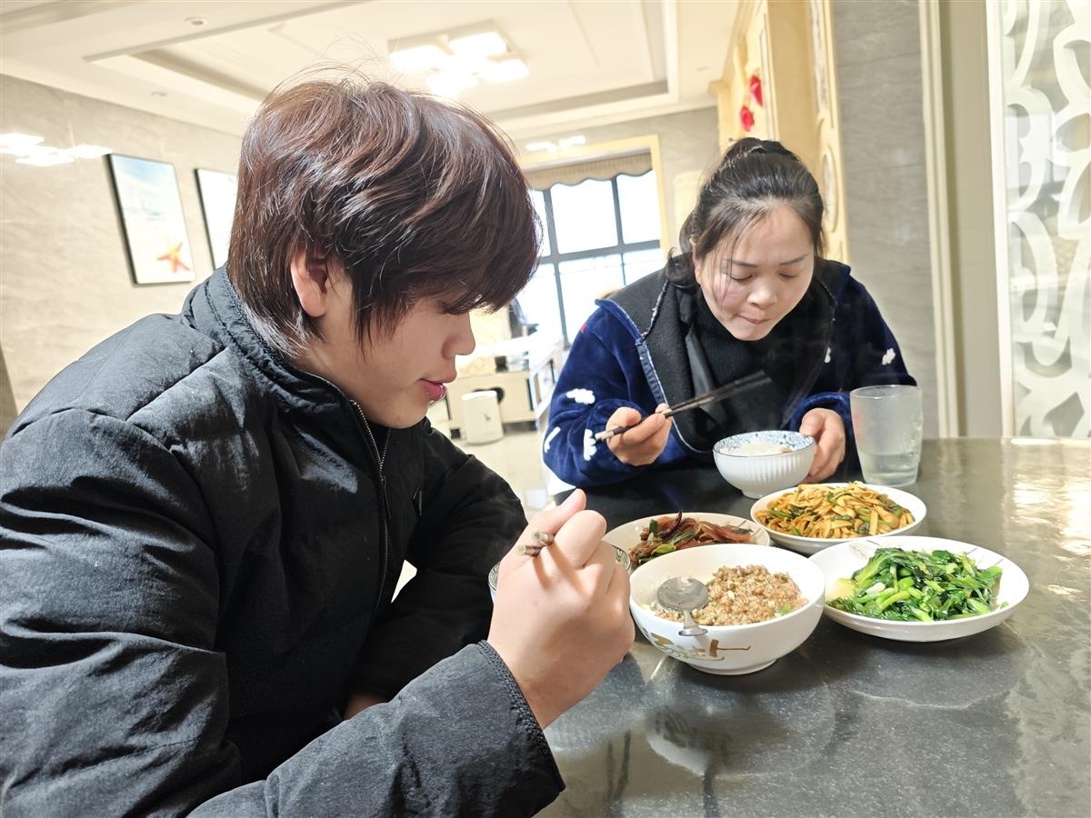 邱多生和儿子明鑫鑫一起吃晚餐 通讯员刘轩摄