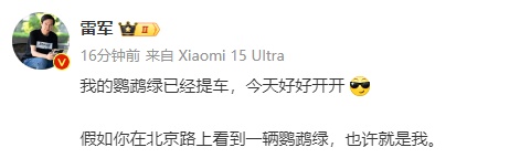 3月12日,雷军发文称已提小米SU7 Ultra鹦鹉绿新车,并表示今天要好好开开车,如果网友在北京路上看到一辆鹦鹉绿,也许就是他在开车。