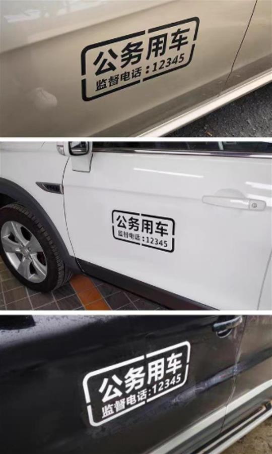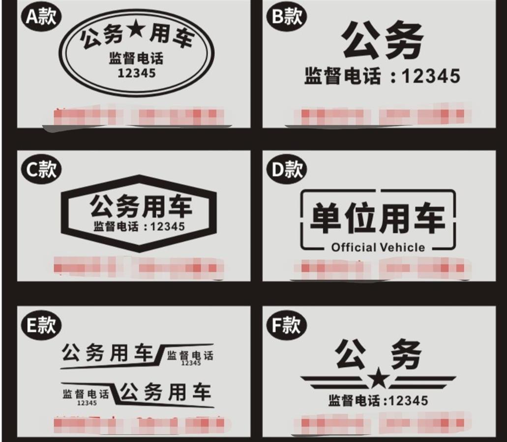 展示的样图中,“公务车贴”上印有监督电话12345,外侧带框或带星,与官方正规的“公务车贴”相似,文字前面甚至能加“省级机关”字样。