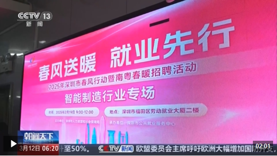 记者在深圳“南粤春暖”智能制造行业专场招聘会现场看到,有72家企业提供了上千个优质岗位,涵盖智能制造、新能源汽车等多个领域。