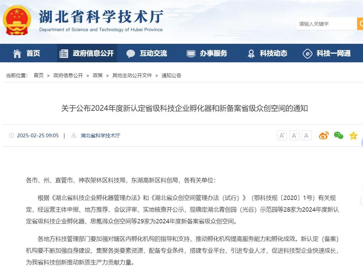 日前,湖北省科技厅公布了《关于公布2024年度新认定省级科技企业孵化器和新备案省级众创空间的通知》,新增28家省级科技企业孵化器、29家省级众创空间。