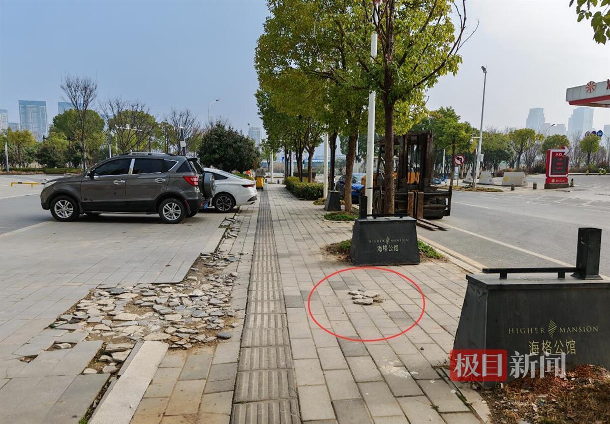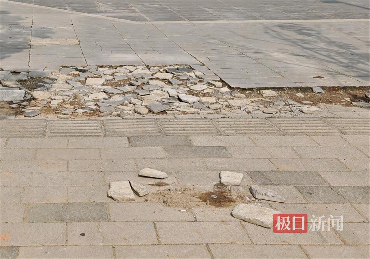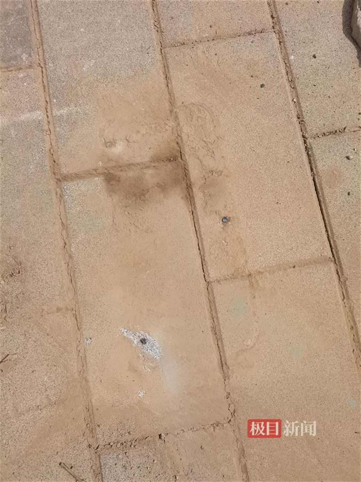 6日上午,极目新闻记者来到墨子路,在黄先生摔倒的地方看到,地锁已不见踪影,只留下一堆碎石。扒开碎石看到,下面有4枚伸出地面约5厘米的螺丝钉。
