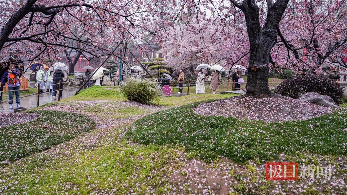 樱花园打卡墙上以东湖蓝为底,绘制樱花元素的图案,墙面上精心绘制艺术字绘,长江大桥、武汉关、编钟、东湖之眼、五重塔等重量级地标跃入墙上,每一笔都勾勒出武汉和东湖的独特魅力;梦幻花境大草坪精心打造“一棵树”景观,一株独立的樱花树伫立在草坪中央,一面与樱花林交相辉映,另一面与古建筑相互映衬,再搭配立体爱心景观,形成绝美拍照打卡点;300米长的樱花大道上绘制春季限定樱花地面彩绘,樱花及花瓣散落在柏油路上,与婆娑的树影、秀丽的春光相映成趣,游人还可与地面上直径为1.8米的樱花花朵合影,珍藏樱花园春日浪漫。