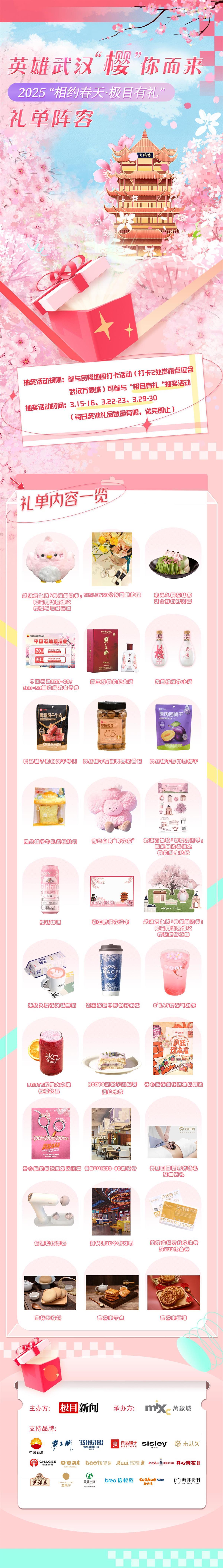 据悉,自3月12日“英雄武汉 樱你而来——2025相约春天·极目有礼”活动启动之后,进入极目新闻官方微信公众号,点击底部菜单“赏樱地图”即可参与地图互动。活动期间,只需在任意赏樱点位拍照打卡,再加上一张武汉万象城“春樱漫闪季”樱花场景同框照片,即可在武汉万象城参与“2025相约春天·极目有礼”抽奖活动(每日奖池礼品数量有限,送完即止)。