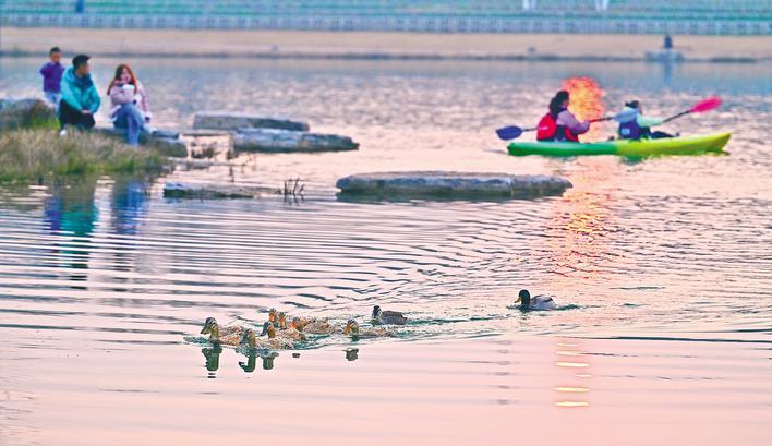 宜昌市卷桥河湿地生态公园,游客挥桨划船,野生水鸟自在嬉戏。 (湖北日报全媒记者 刘曙松 摄)