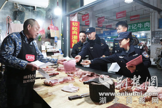 治安管理大队联合环境和食药侦大队与市场监管部门成立专项检查组,对农贸市场内的肉铺、水产店等重点场所开展拉网式排查。执法人员严格核查经营资质、进货渠道、检疫证明及食品添加剂使用情况,同步开展食品安全法规宣传,督促经营者落实主体责任,严把食品质量源头关。