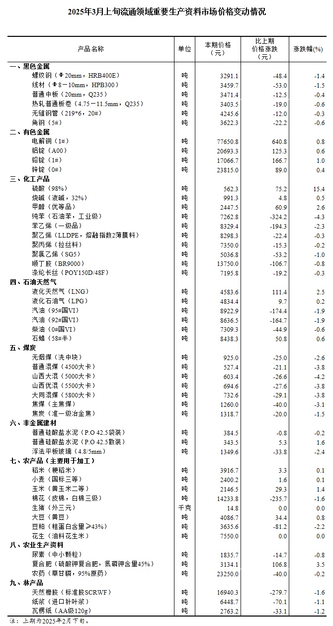 人民网北京3月14日电 (记者杨曦)国家统计局发布数据显示,据对全国流通领域9大类50种重要生产资料市场价格的监测显示,2025年3月上旬与2月下旬相比,16种产品价格上涨,32种下降,2种持平。