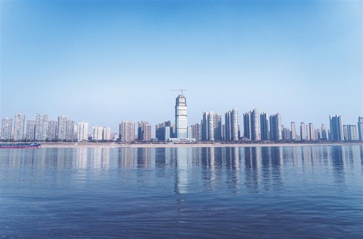 不远处,原来的罗镜滩渡口也见证了宜昌的变化。过去,一批工业企业集中在江对岸的伍家岗区,人们从罗镜滩渡口乘船到江对岸求学工作。2019年,为保护长江生态环境和改善中华鲟自然保护区水域环境,罗镜滩渡口关停。如今,江对岸的工厂已经不见踪影,取而代之的是拔地而起的高楼,其中就包括去年10月封顶的中建·宜昌之星时代中心项目。这幢43层、高度约220米的摩天大楼伫立在长江北岸,成为打卡照中颇具特色的背景。