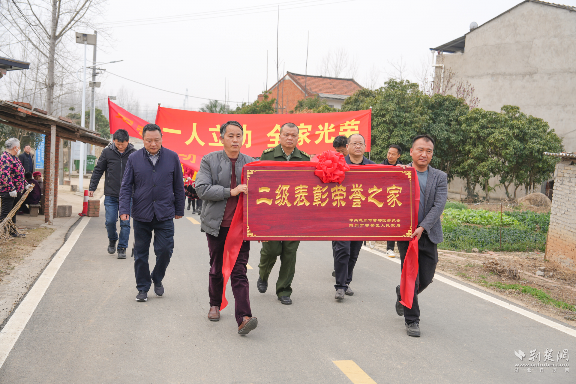 荆楚网(湖北日报网)讯(通讯员常梦星)3月13日上午,随州市曾都区人民政府、区人武部、区退役军人事务局等相关部门联合到淅河镇楼子湾村,为荣获二级表彰的现役军人李盼家庭送去立功喜报、牌匾和慰问金,让军属共享军人荣耀和喜悦。
