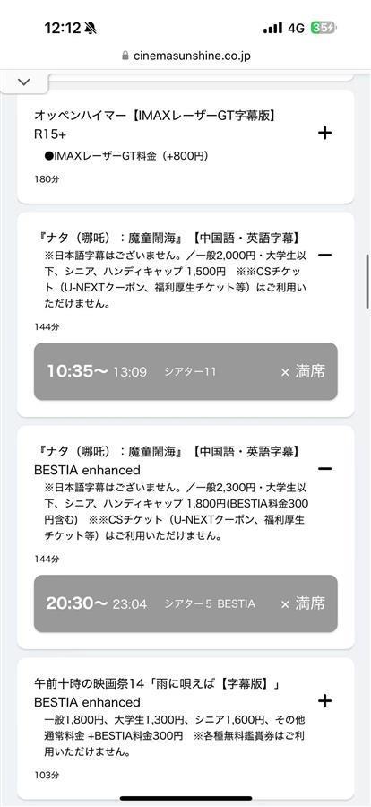“目前,3月19日之前,5天之内的哪吒电影票基本上都已经被抢光了。”今天上午,李女士查询网上购票平台发现,因为目前属于限定上映,东京只有6家影院上映《哪吒2》,整个日本也只有20多家影院上映,火一点的电影院都显示“满席”,其他一些地方的电影院,也只剩少量位置不好的座位。