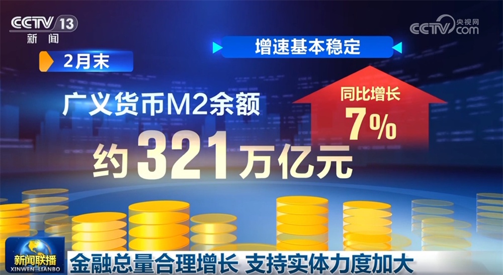 2月末,社会融资规模存量约417万亿元,同比增长8.2%,继续保持较快增长。广义货币M2余额约321万亿元,同比增长7%,增速基本稳定。前两个月人民币贷款增加6.14万亿元。