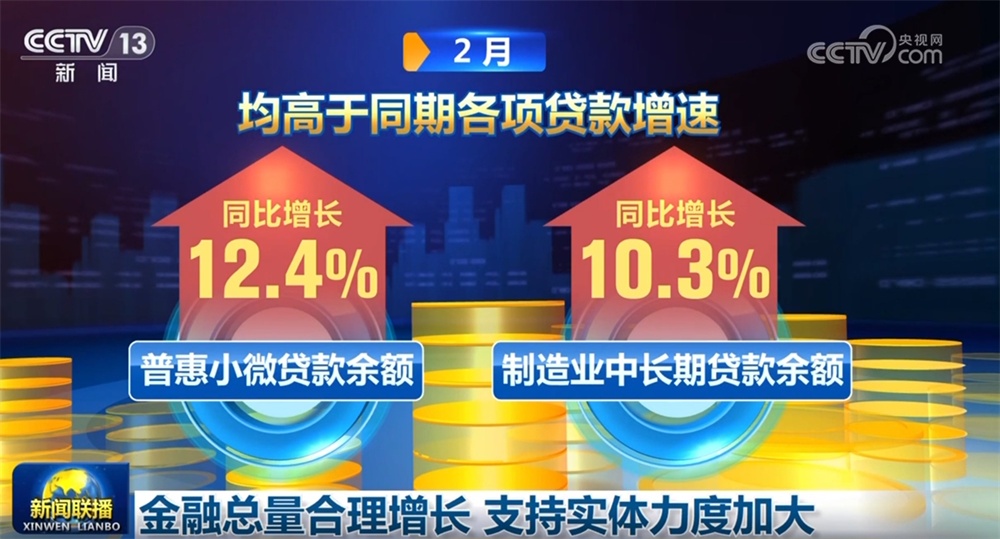 信贷结构也出现不少亮点。2月,普惠小微贷款余额、制造业中长期贷款余额分别同比增长12.4%、10.3%,均高于同期各项贷款增速。在四川眉山,银行根据企业税务数据和用电量实时计算授信额度,小微企业不需要提供任何抵押物也能快速获得贷款。这家企业仅用三天就获得了150万元无抵押贷款。