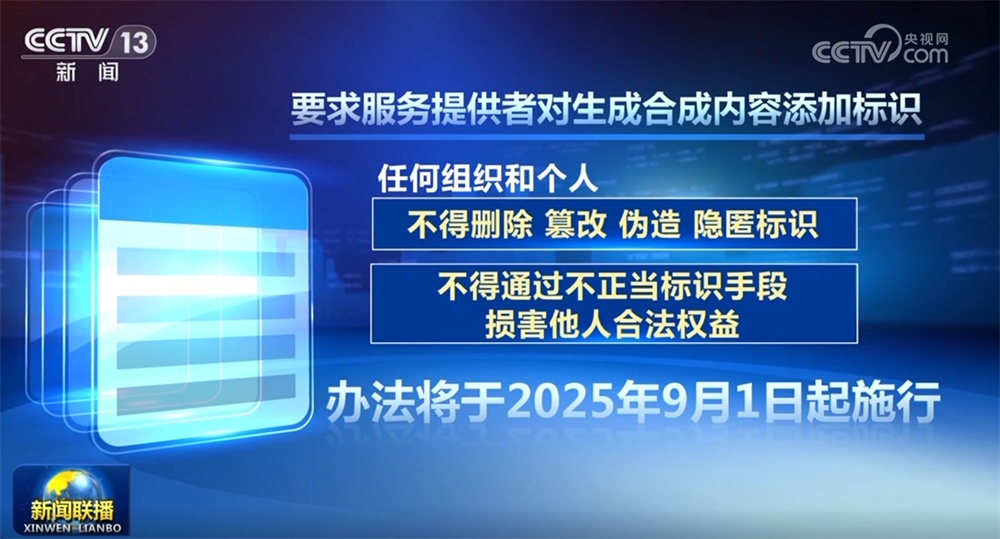 国家网信办等四部门近日联合发布《人工智能生成合成内容标识办法》,要求服务提供者对生成合成内容添加标识。任何组织和个人不得删除、篡改、伪造、隐匿标识,不得通过不正当标识手段损害他人合法权益。办法将于2025年9月1日起施行。