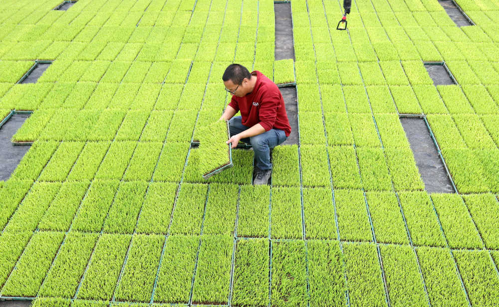 3月14日,浙江省湖州市德清县洛舍镇东衡村先丰农业智能育秧工厂内,工人在观察早稻秧苗长势。新华社发(谢尚国 摄)