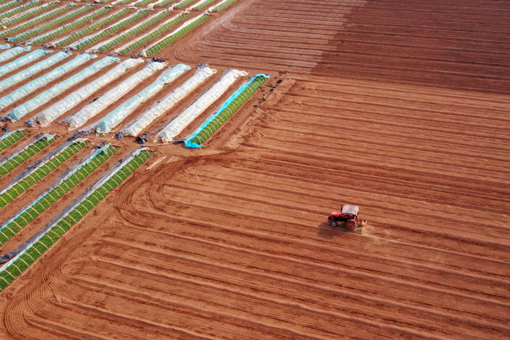 3月13日,在山东省临沂市郯城县郯城街道一处蔬菜种植基地,农民查看滴灌设备精准“补水”情况。新华社发(张春雷 摄)