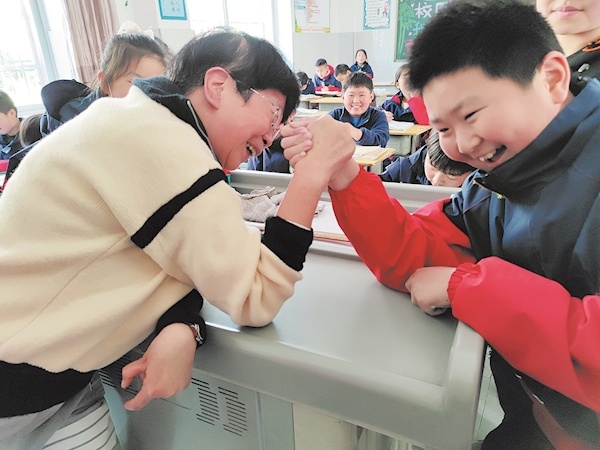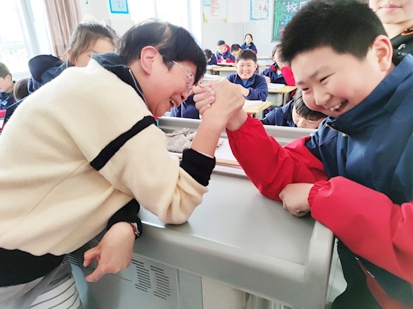 张葆珺和学生比赛掰手腕