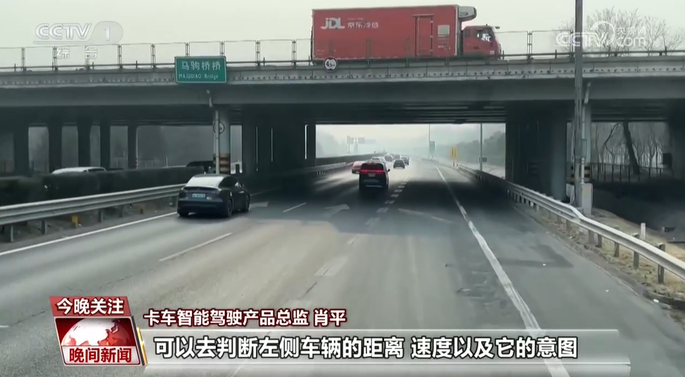 卡车智能驾驶产品总监 肖平:目前是法律监管要求的一个阶段,所以主驾位配置了安全员。左侧的车流是非常快的,这个时候就需要依据驾驶车辆周身360度的感知能力,去判断左侧车辆的距离、速度以及它的意图。
