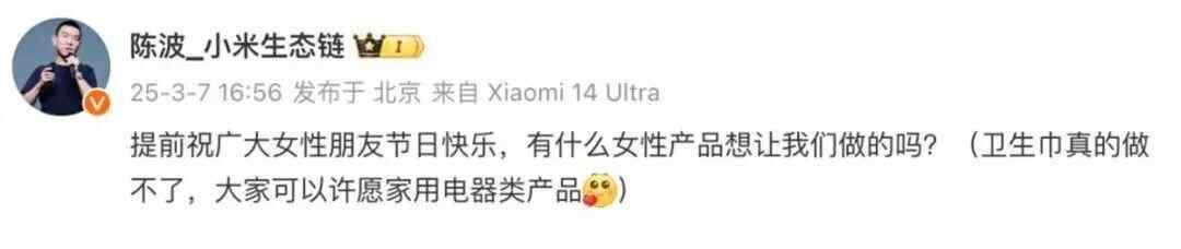 关于小米是否会生产卫生巾等产品,此前3月7日,小米生态链总经理陈波发文:“提前祝广大女性朋友节日快乐,有什么女性产品想让我们做的吗?(卫生巾真的做不了,大家可以许愿家用电器类产品)”