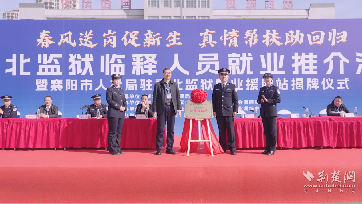 本次揭牌的襄阳市人力资源和社会保障局驻襄北监狱就业援助站是全省监狱系统首个在监狱建立的针对即将刑满释放人员的就业援助站,旨在帮助刑释人员推荐门槛低,易就业的工作岗位,并定期报送本地就业信息,为刑释人员提供政策支持,同时襄阳市司法局还在现场对服刑人员开展“送法进高墙”普法宣讲活动。