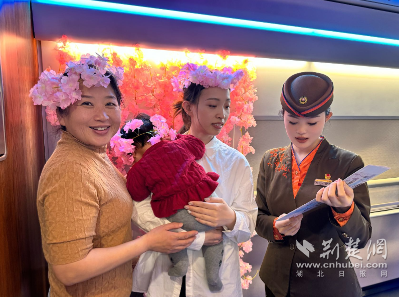 荆楚网(湖北日报网)讯(通讯员卢佳)3月18日,武汉客运段G878次列车从深圳北站驶向武汉,一场别开生面的“赏樱之旅”宣传活动在车厢内温馨开启。列车员徐婷婷精心布置了浪漫的“樱花墙”,为车厢内的姑娘们戴上樱花花环,将武汉的春日美景提前带到了旅客身边,让车厢内充满了浪漫与诗意。