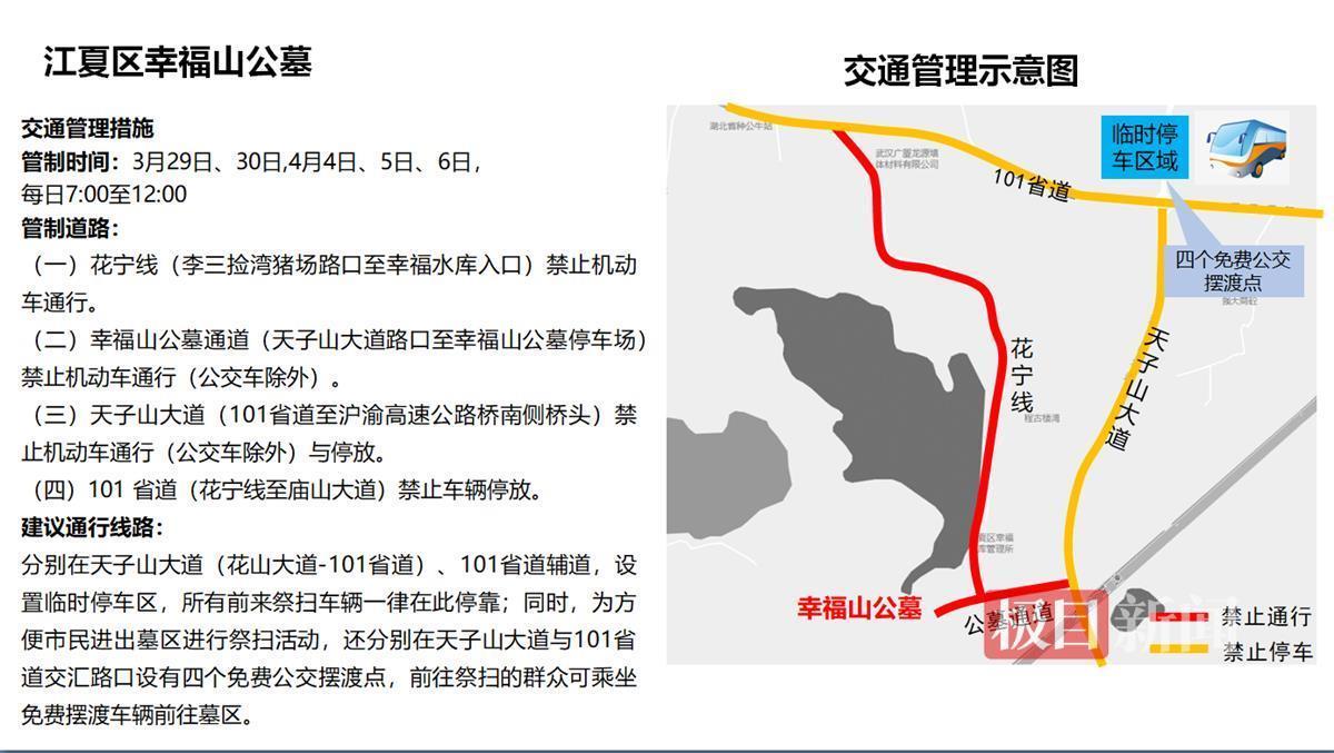 又到一年清明时,3月18日,武汉市公安局交通管理局发布通告,将在清明节期间(本周末起)对墓区周边部分道路实施临时交通管理措施,保障2025年清明节期间全市道路交通安全畅通。武汉交警提醒:请大家合理安排出行时间,尽量选择公共交通出行;如需驾车前往,请提前规划好路线,错峰出行。