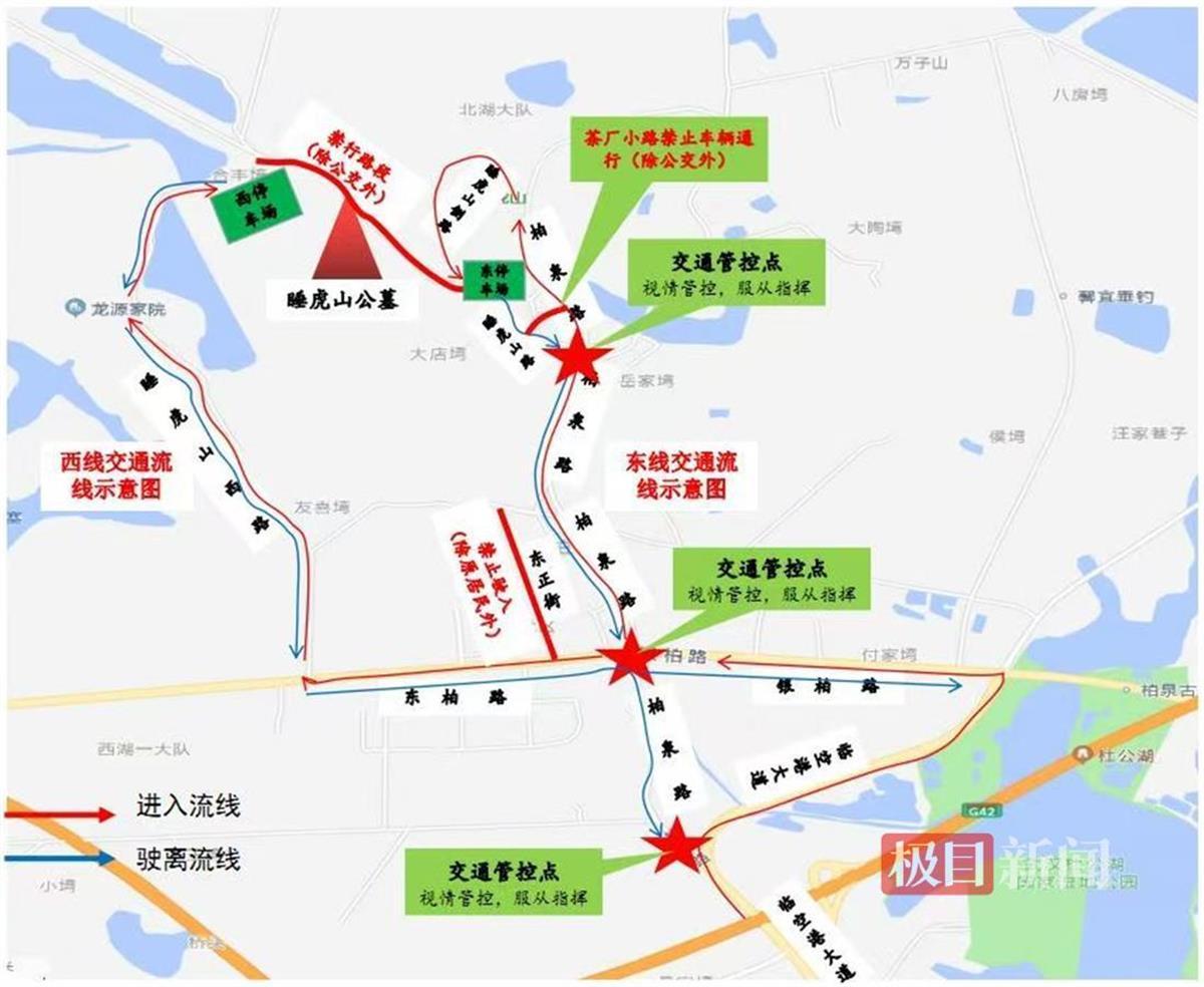 (七)白汊湖路(一沟两路)实行单向循环通行,即北侧通道实行由东向西通行、南侧通道实行由西向东通行。内部停车场饱和后,北侧通道实行临时管制,禁止车辆驶入,南侧通道仅允许车辆驶离;陵园临近支路、通道禁止车辆驶入。