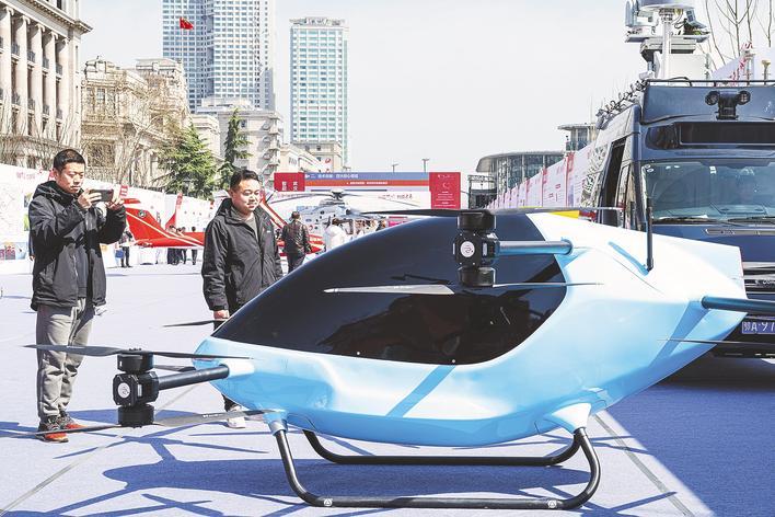 3月18日,武汉低空经济新品发布会在江汉关广场举行。是云航空展示的新款无人机吸引与会者的目光。 (湖北日报全媒记者 任勇 摄)