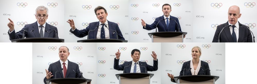 图为七名参加国际奥委会主席选举的候选人(排名不分先后)。第一行左起:小萨马兰奇、塞巴斯蒂安·科、大卫·拉帕尔蒂安、约翰·埃利亚施;第二行左起:费萨尔·侯赛因、渡边守成、柯丝蒂·考文垂。新华社发(POOL照片/法布里斯·科弗里尼)
