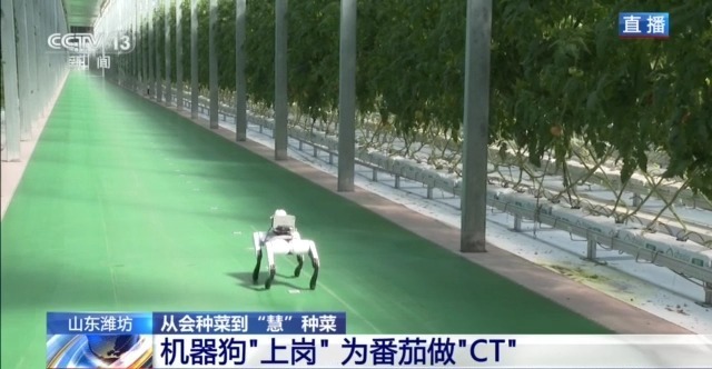 总台记者 苏琪淇:在这里,充满未来感的不只是外观,这里还有一位特殊的新同事——旺财。在寿光的蔬菜大棚里,机器狗也“上岗”种菜了。大家可别小看这位“汪星人”,它搭载的摄像头、环境采集传感器和内置的AI算法,可以执行重要使命。
