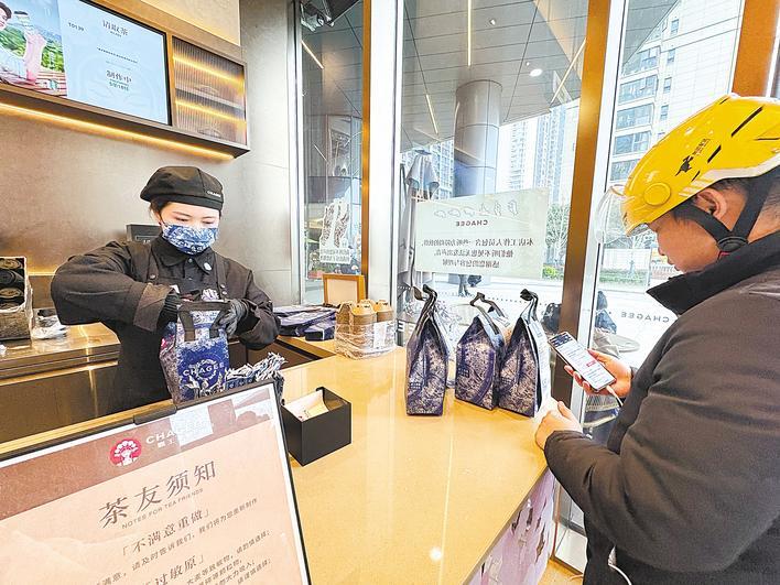 听障店员郑玲玲正在为顾客打包奶茶。(湖北日报全媒记者 朱惠 摄)