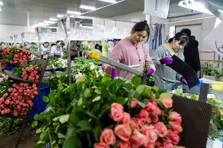 3月16日,在云南省楚雄彝族自治州姚安县,工作人员在姚安毅云花卉有限公司分拣包装车间内包装鲜花。新华社记者 陈欣波 摄