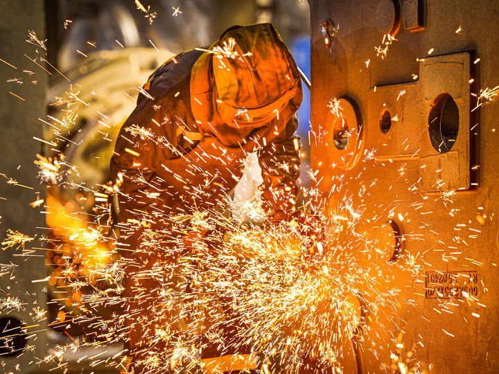 2月7日,在浙江省宁波市鄞州区东吴镇的日月重工厂区,工人打磨抛光风电设备部件。新华社发(胡学军摄)