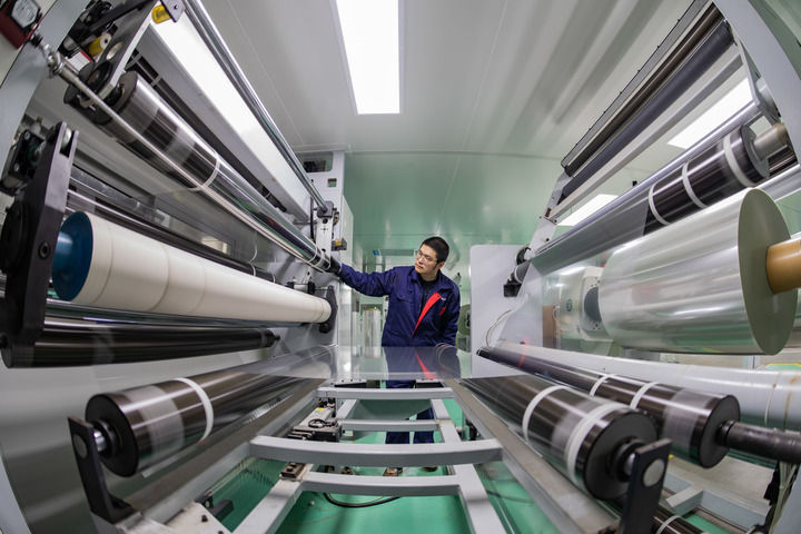 3月8日,在位于江苏盱眙的江苏宇狮薄膜科技有限公司,工人在生产车间忙碌。新华社发(邵光明摄)