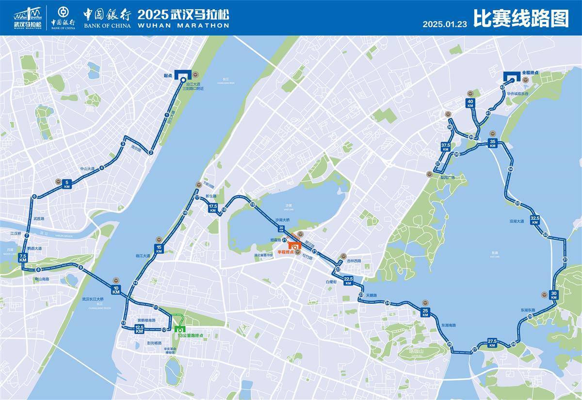 比赛线路途经武汉市多个重要区域和地标建筑。全程马拉松线路从沿江大道三阳路口出发,沿途经过沿江大道、南京路、中山大道等,跨越长江大桥,进入武昌后,经彭刘杨路、临江大道等,最终抵达欢乐大道武汉欢乐谷;半程马拉松线路前期与全程马拉松重合,在楚汉路沙湖大道路口掉头后,经楚汉路辅路、烟霞路,到达松竹路的半程终点;13公里跑线路则是从起点出发,跨越长江大桥后,经黄鹤楼东路,抵达武昌路的13公里跑终点(首义广场)。