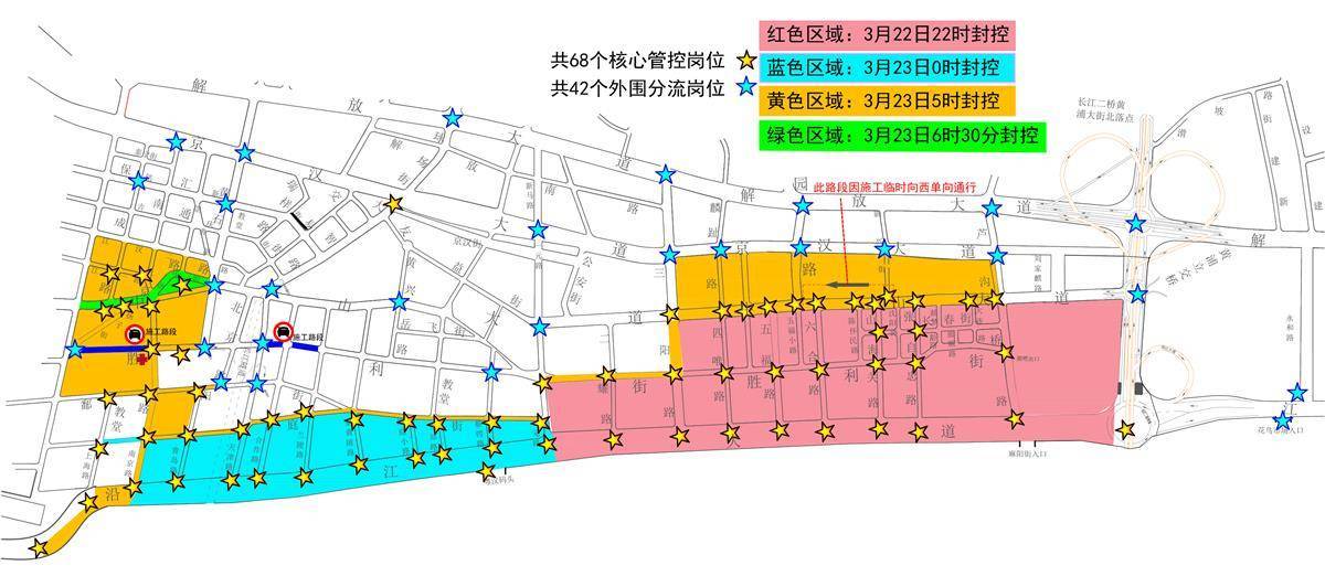 3月23日当天,不同时段有多条道路逐步实施交通限制措施。0时起,沿江大道(一元路至南京路)、洞庭街(上海路至南京路)、一元路、蔡锷路、车站路、洞庭小路、兰陵路、合作路、天津路、青岛路等上述道路的沿江大道至洞庭街段禁止车辆通行;5时起,沿江大道(民生路至南京路)、南京路(沿江大道至江汉二路)、洞庭街(青岛路至南京路)、鄱阳街(青岛路至上海路)、扬子街、江汉一路、胜利街(一元路至三阳路)、三阳路(胜利街至中山大道)、中山大道(三阳路至芦沟桥路)、麟趾路、天德里路、解放公园路、新兴街、芦沟桥路西侧等上述道路的中山大道至京汉大道段也禁止车辆通行;6时30分起,中山大道(黄石路至崇仁路)、武胜路(中山大道至沿河大道)、武胜路高架桥、江汉桥禁止车辆通行;6时45分起,江汉桥东、西两侧知音大道匝道,鹦鹉大道(江汉桥至汉阳大道)、琴台大道(五琴路至文化宫环岛)、龟北路、文化宫立交,龟山南路,长江大桥,首义广场地下通道,黄鹤楼东路,黄鹤楼南路,武昌路禁止车辆通行;7时15分起,彭刘杨路、彭刘杨西路、楚善街(长湖正街至彭刘杨路)、武珞路(首义路至武昌路)、临江大道(张之洞路至新河后街)、新生路、和平大道(新河后街至前进路)、中山路(临江大道至解放路)、解放路(大成路至读书院路)、友谊大道(前进路至武车路)禁止车辆通行;7时30分起,沙湖大桥、楚汉路(沙湖大桥至杏林西路)、烟霞路、东湖路(杏林西路至天鹅路)、白鹭街、天鹅路、杏林西路禁止车辆通行;7时45分起,卓刀泉北路(东湖东路至八一路)、东湖南路禁止车辆通行;8时起,鲁磨路(梅园大门至植物园路)、沿湖大道(梨园广场北路至梨园广场南路)、梨园广场北路、渔光小路、杨园南路(华电小路至二环线地面层)、二环线地面层辅道(梨园广场北路至梨园医院)、红庙立交地面一层、东湖隧道梨园医院段地面层辅道(红庙立交地面一层至银杏原路)、九女墩路、银杏原路、渔光路、紫薇路、欢乐大道(银杏原路至紫薇路)南侧辅道禁止车辆通行。同时,以上道路相邻路段及路口,将视情实施临时交通限制措施。