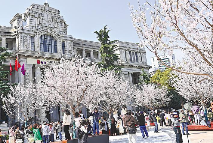 3月18日,武汉江汉关广场的樱花首次绽放,江城多了一处赏花地。(湖北日报全媒记者 朱熙勇 摄)