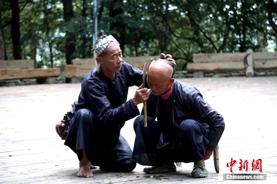 从江县丙妹镇岜沙苗寨,村民在向游客展示传统的“镰刀剃头”技艺。张素 摄