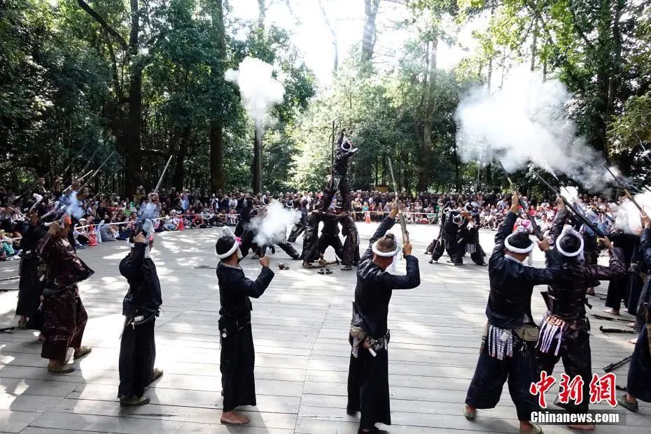 岜沙苗寨村民用火枪为游客表演。中新社记者 侯宇 摄