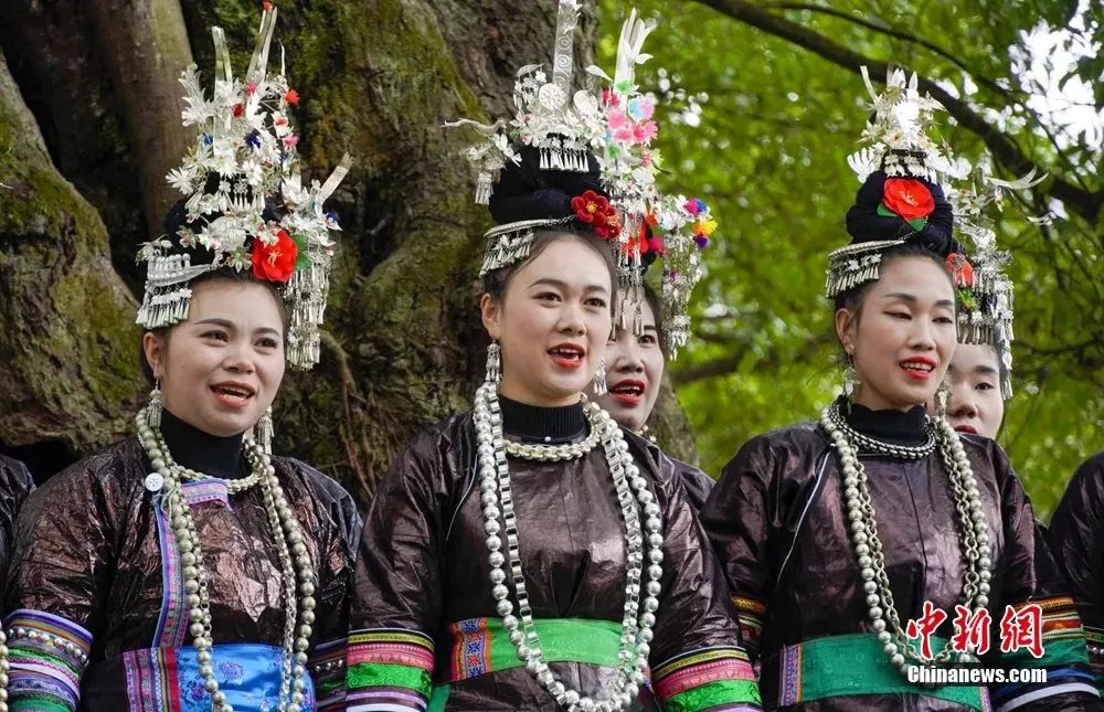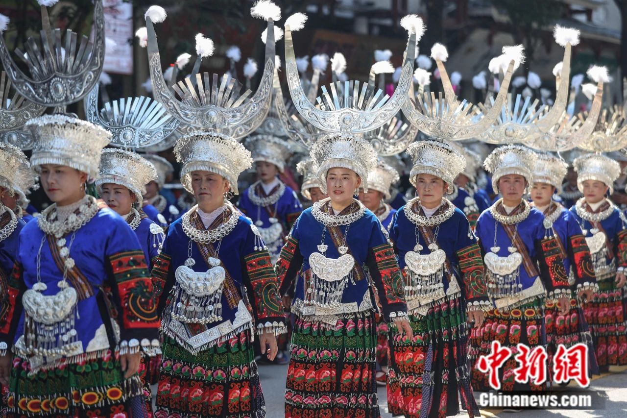 贵州台江:民众着苗族盛装巡游欢度“姊妹节”。中新社记者 瞿宏伦 摄
