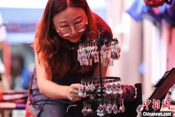 绣里淘非遗集市里的“银饰+苗绣”组合耳饰吸引游客选购。中新社记者 瞿宏伦 摄
