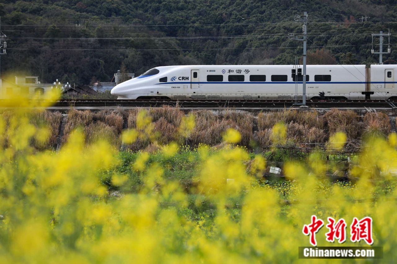 动车组列车从贵广高铁黔东南州从江县境内的油菜花田旁驶过。中新社记者 瞿宏伦 摄