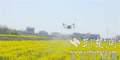 在洋梓镇肖山村,无人机正在进行喷洒作业。通过喷施磷酸二氢钾、植物生长调节剂、杀虫剂、杀菌剂等混配液促进油菜生长发育,防花而不实、防早衰、防菌核病、防高温逼熟,从而增加油菜角果数和粒重。同时,钟祥农业部门还对油菜生产进行全程技术跟踪指导,让种植户省心省力提升油菜单产。