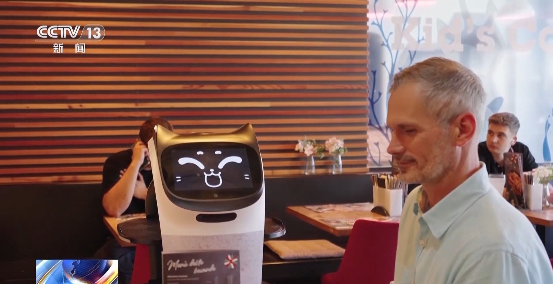 深圳普渡科技首席技术官 郭璁:摸耳朵,它会有一些不同的表情会出现。能给客户提供两种价值,第一种是功能价值,它能够真正帮客户解决一些问题;第二是情绪价值,消费者看到这些机器人之后觉得它很有趣。
