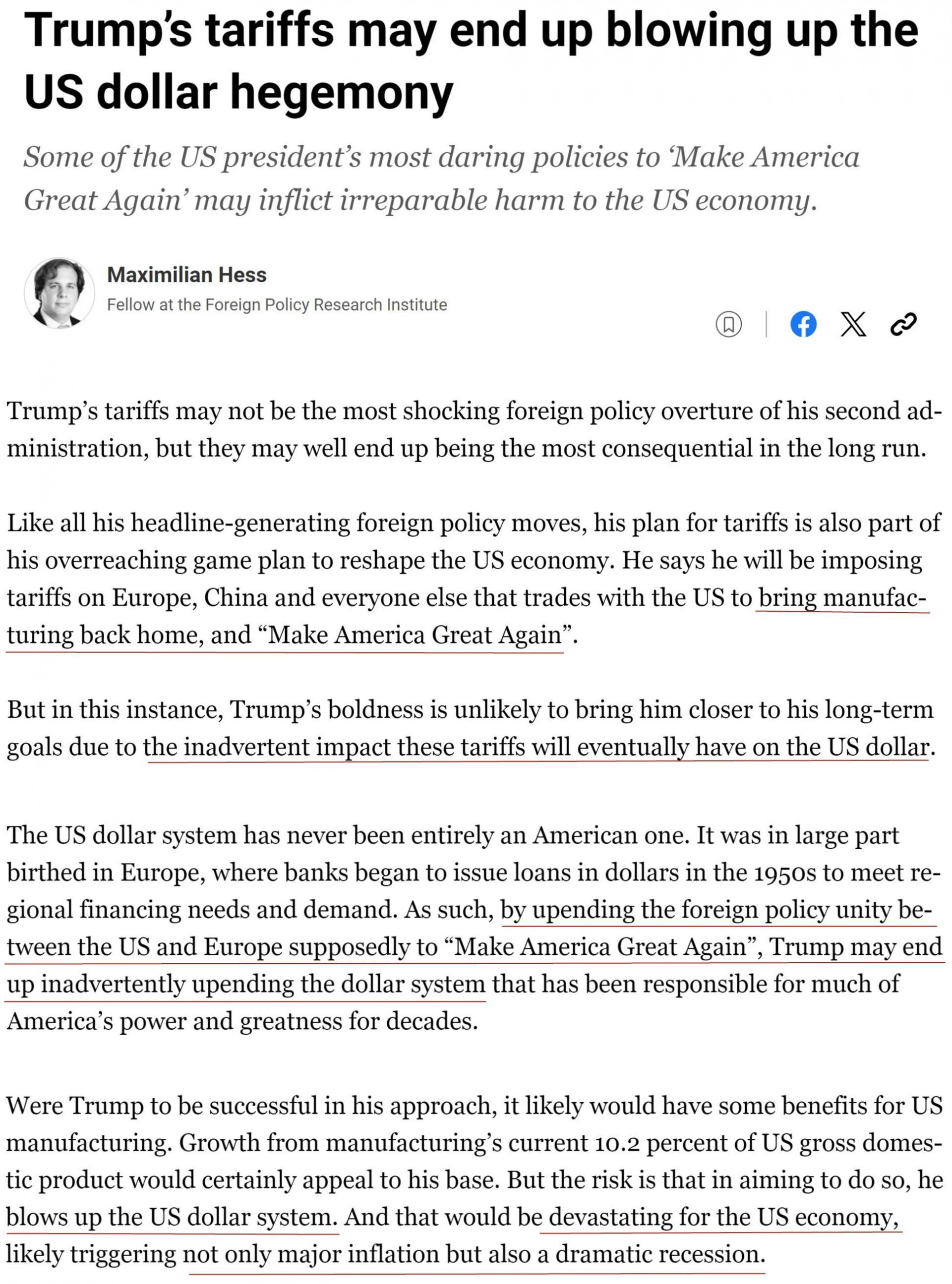 文章指出,一直以来,全球对美元的需求使其成为美国的主要出口产品。正是这种“过分的特权”使美国能够在不对经济造成重大负担的情况下长期维持贸易和财政赤字。而如今特朗普政府的关税政策可能最终摧毁美元霸权,从而使美国经济遭到毁灭性打击。