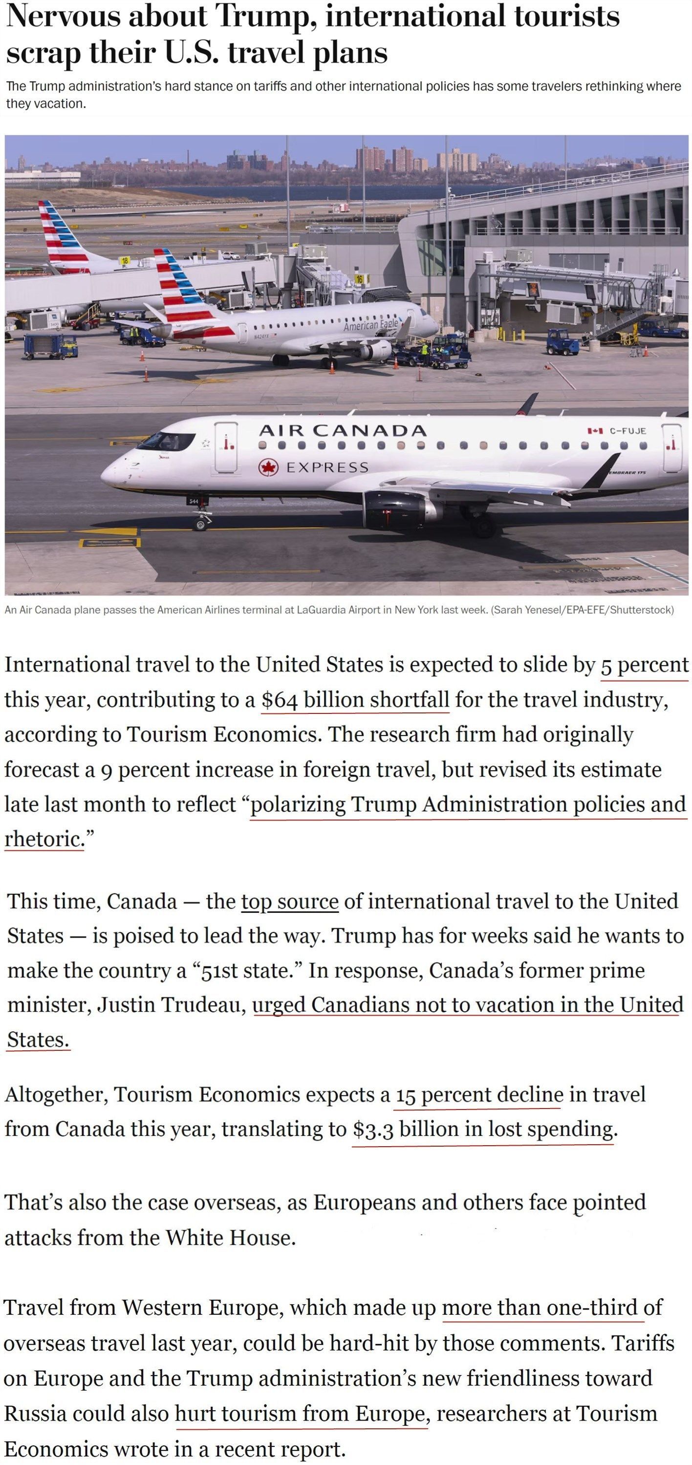 或许更让美国始料未及的是,外国游客也被关税“气”跑了。