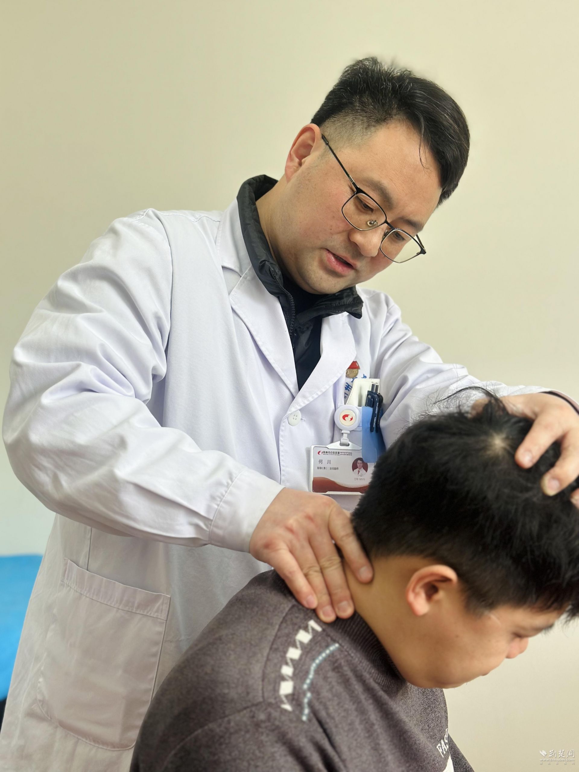 诊室里飘着中药草香,何川的双手正进行着另一种“手术”。只见他双掌托住患者下颌与枕部,拇指精准感知寰枢关节的细微错位,突然发力旋扳,“咔嗒”轻响中完成复位。患者惊呼“还没觉着疼,颈部就松快了”。