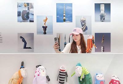 文旅出游热浙江宁波,参观者在展会上与文创作品合照。会展经济火热,文创产品走红,不断满足青年群体文化消费的新需求。胡学军摄(影像中国)