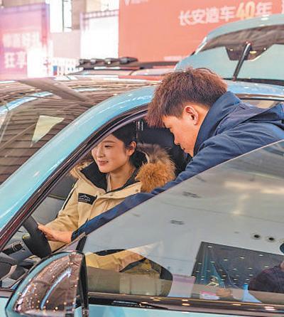 消费理念新绿色低碳理念深入人心。图为内蒙古呼和浩特冬季新能源汽车展上,观众在试驾一款国产新能源汽车。丁根厚摄(影像中国)