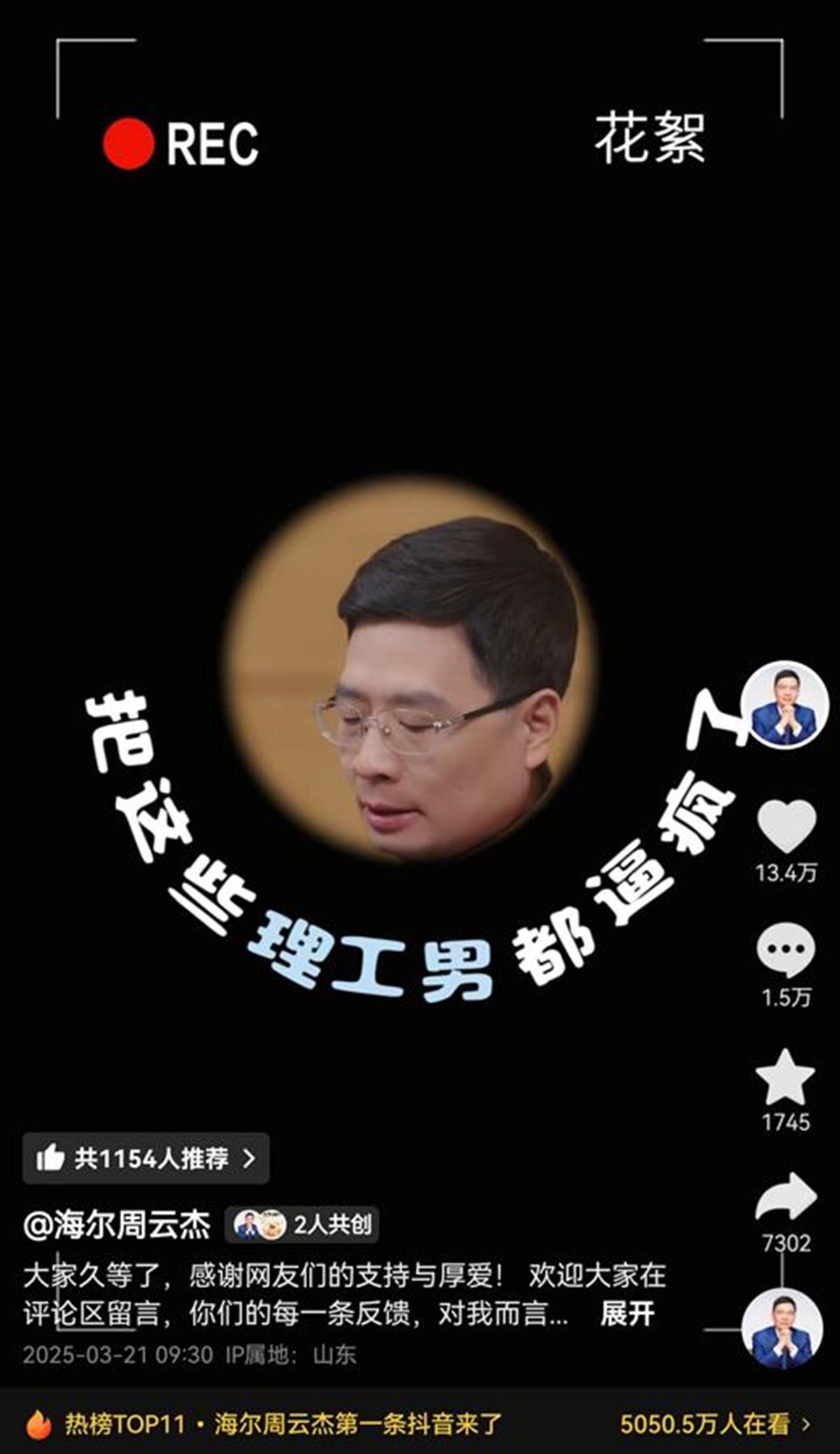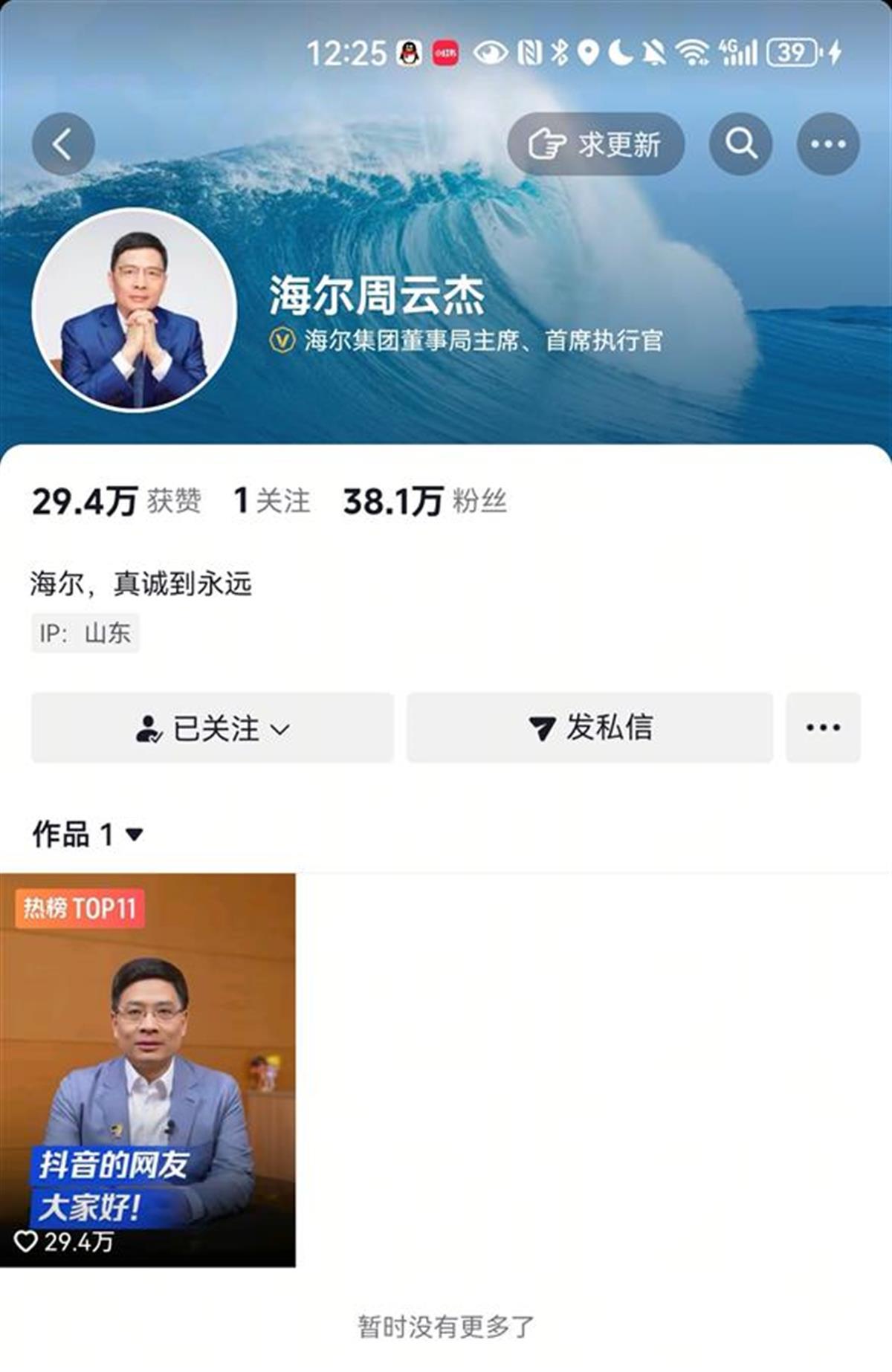 稍早前的上午9点半,周云杰也发布了其开通抖音后的首条视频表示:“感谢网友们的支持与厚爱,今天如约而来,正式入驻抖音。开通这个账号,就是想建立一个和大家零距离交互的平台,今后我会常在这里分享海尔的故事,倾听网友的需求,征集大家的建议。欢迎大家在评论区留言。你们的每一条反馈,对我而言都是最好的礼物,也是海尔持续创新的动力。让我们一起为中国智造、中国品牌加油!”