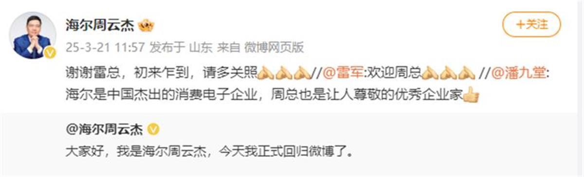 海尔周云杰正式回归微博后,3月21日中午近12时,雷军转发了周云杰的微博:欢迎周总!